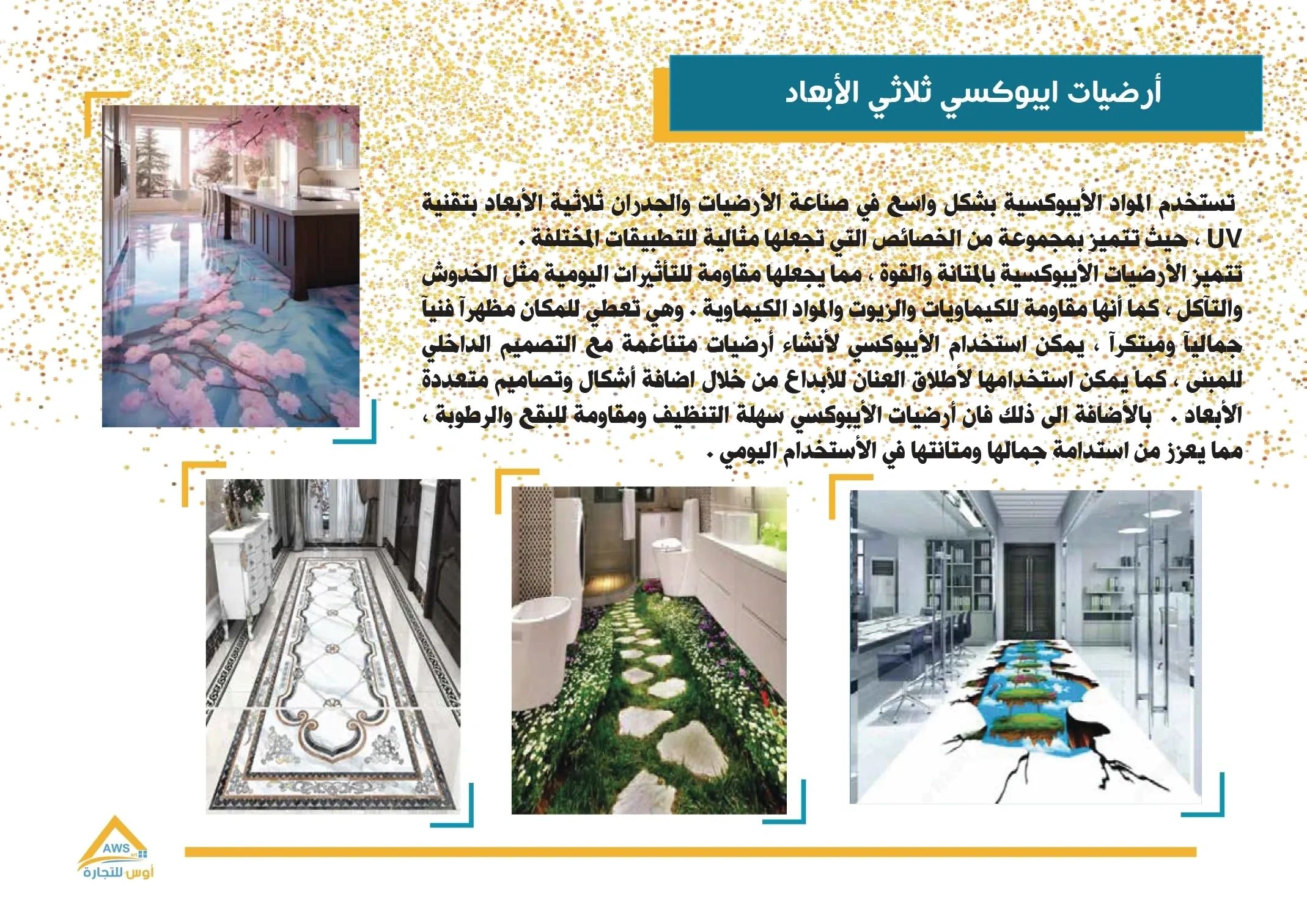 هي نوع حديث من الأرضيات يتم فيها استخدام طلاء الإيبوكسي الشفاف مع رسومات أو صور ثلاثية الأبعاد تُطبع وتُثبت على الأرض، ثم يُسكب فوقها طبقة من الإيبوكسي الشفاف لتعطي مظهراً واقعياً مجسماً.